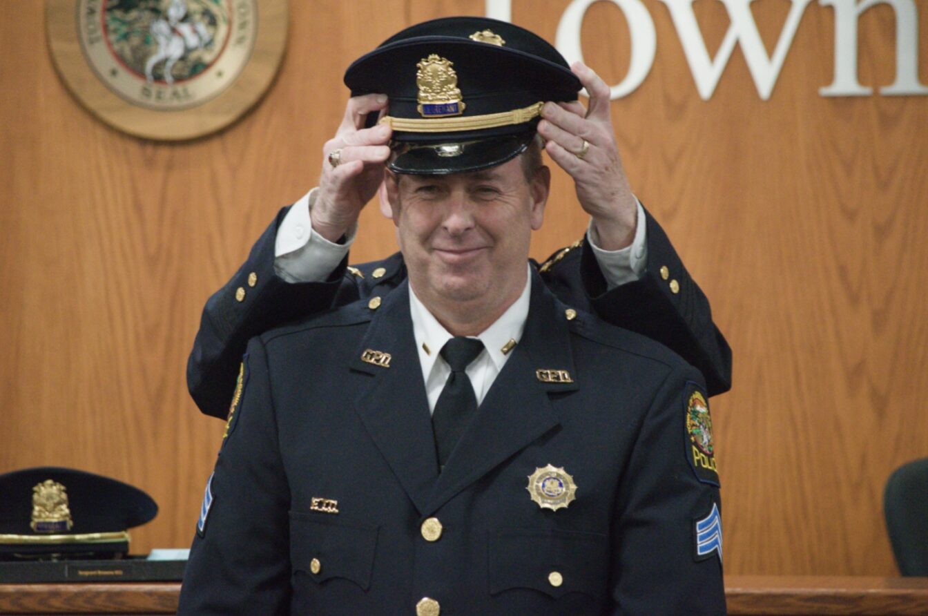 During the ceremony, Browne’s wife, Karen, pinned his new sergeant’s badge and insignia. Chief Heavey then placed the sergeant’s hat on Browne, officially welcoming him into the department’s supervisory ranks.