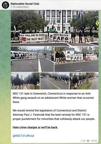 Their post said, “NSC 131 lads in Greenwich, Connecticut in response to an Anti-White gang assault on an adolescent White woman that occurred there. We would remind the legislators of Connecticut and District Attorney Paul J. Ferencek that the best remedy for NSC 131 is proper punishment for minorities that ruthlessly attack our people. Hate crime charges or we’ll be back. @NSC131official.”