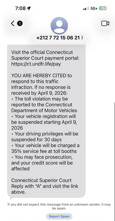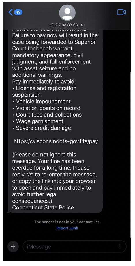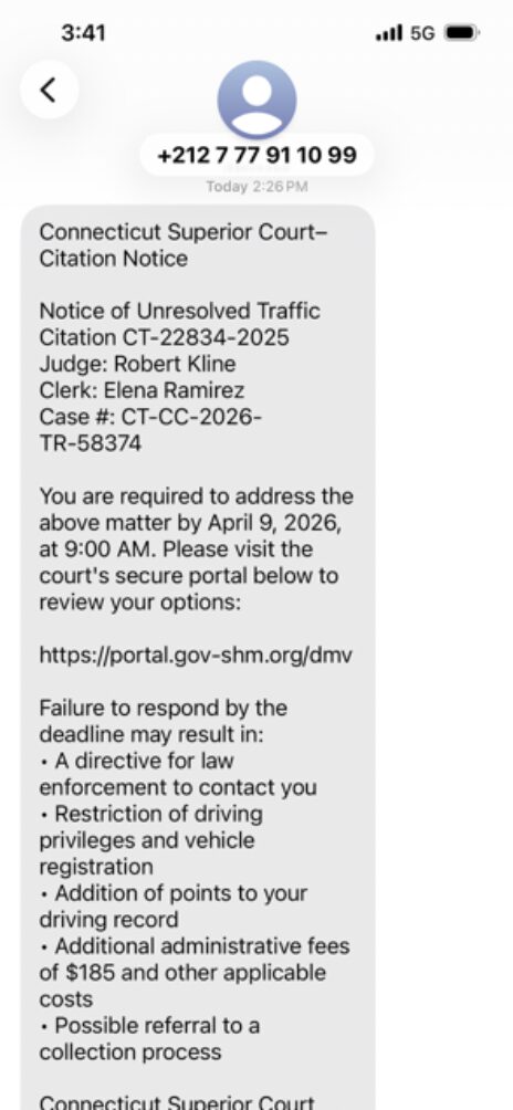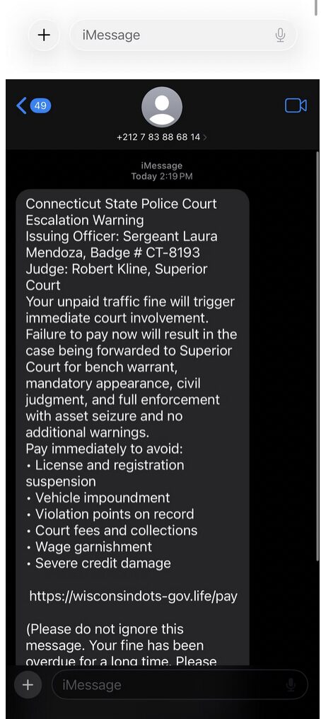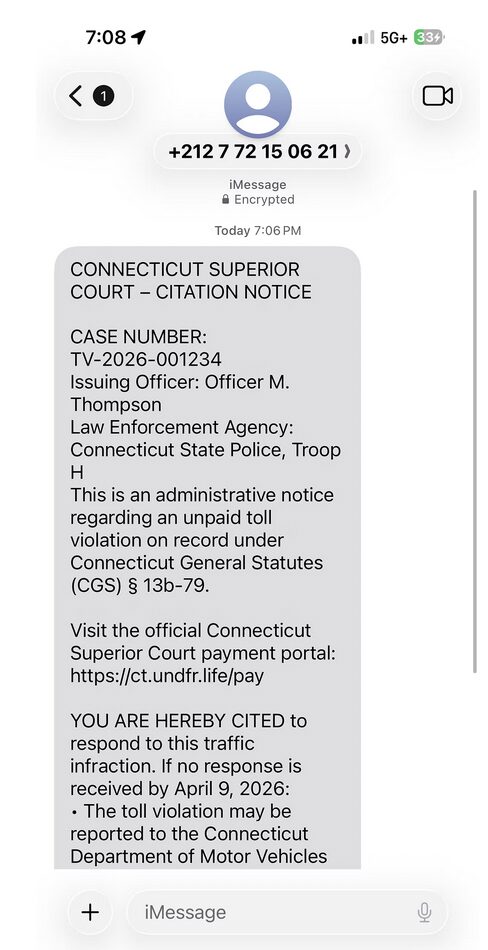 Connecticut State Police are warning the public that if they receive a text claiming to be from the “Connecticut State Police Court” or “Connecticut Superior Court,” DMV, or any government agency demanding immediate payment or threatening suspension of your license or registration — do NOT click the link or reply.