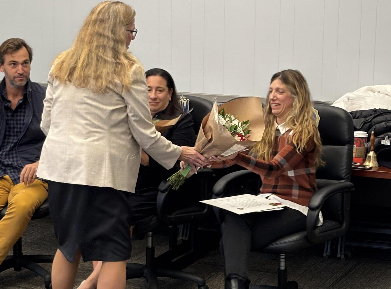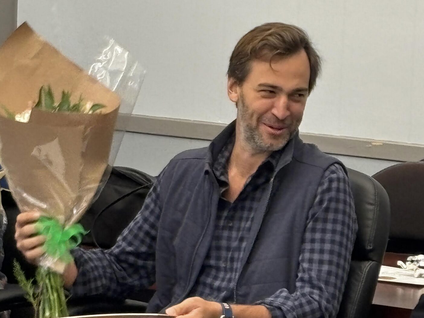 Outgoing BOE member Cody Kittle with flowers. Dec 4, 2025 Photo courtesy Jonathan Supranowitz