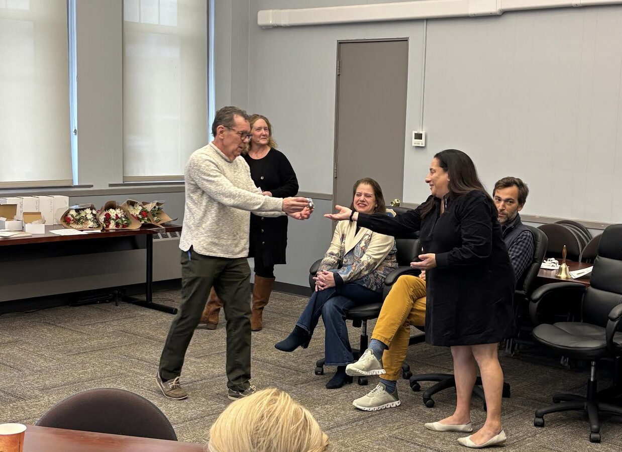 Dr. Jones presents flowers to Kathleen Stowe on Dec 5, 2025. Photo: Jonathan Supranowitz