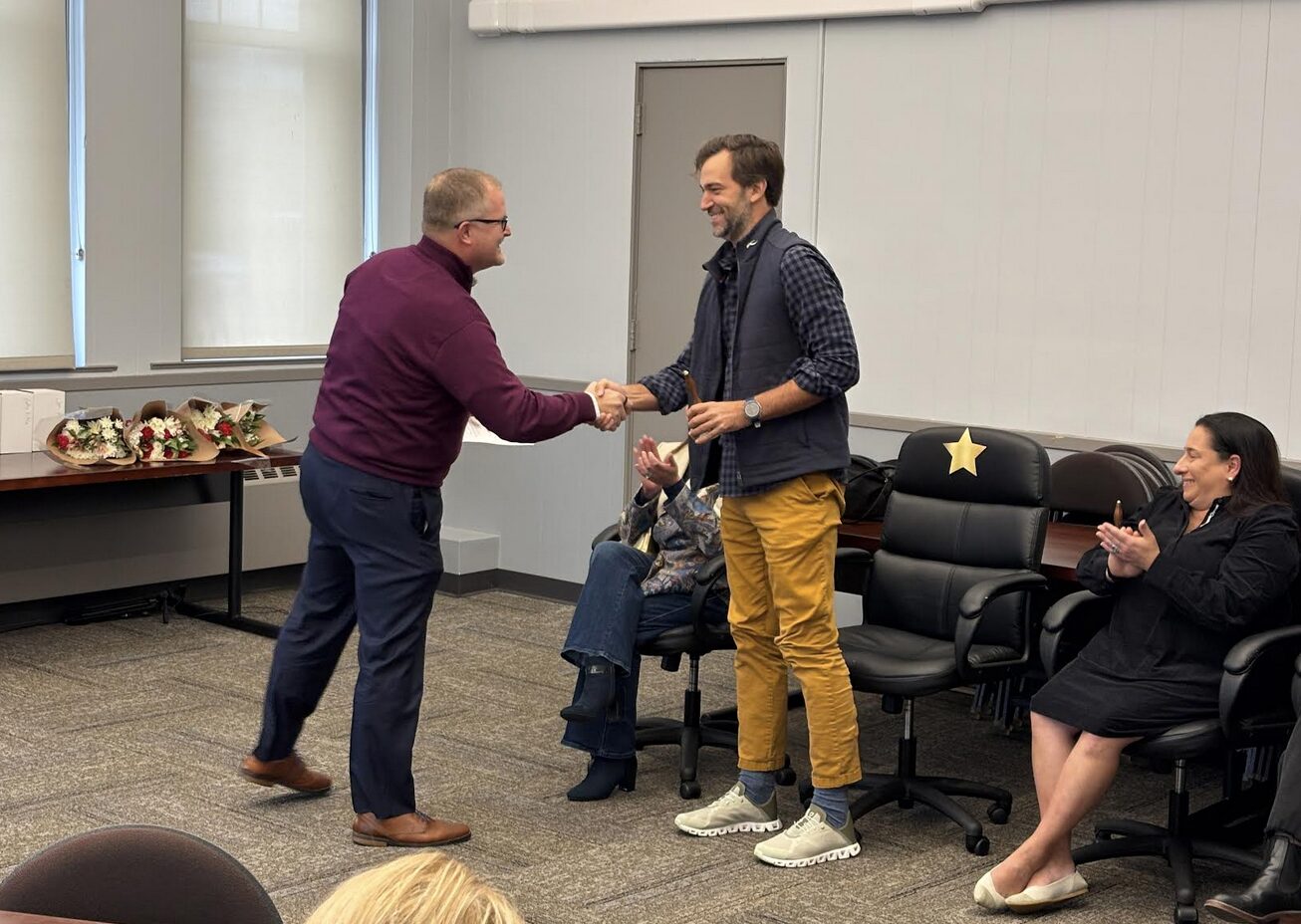 John Fisher congratulates outgoing BOE member Laura Kostin. Dec 4, 2025 Photo courtesy Jonathan Supranowitz