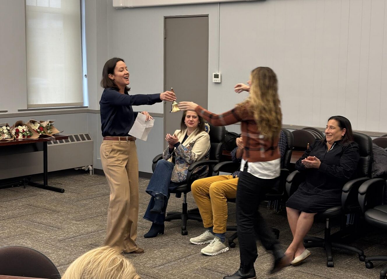 The guests of honor, Jen Behette, Cody Kittle, Laura Kostin, and Kathleen Stowe, were presented gifts that included an engraved teacher brass hand bell from Greenwich Public Schools, a bouquet of flowers from Dr. Jones, and certificates of appreciation and mementos from PTAC’s Lisa Sylvester and John Fisher. Current Board members offered words of recognition for each of the four.