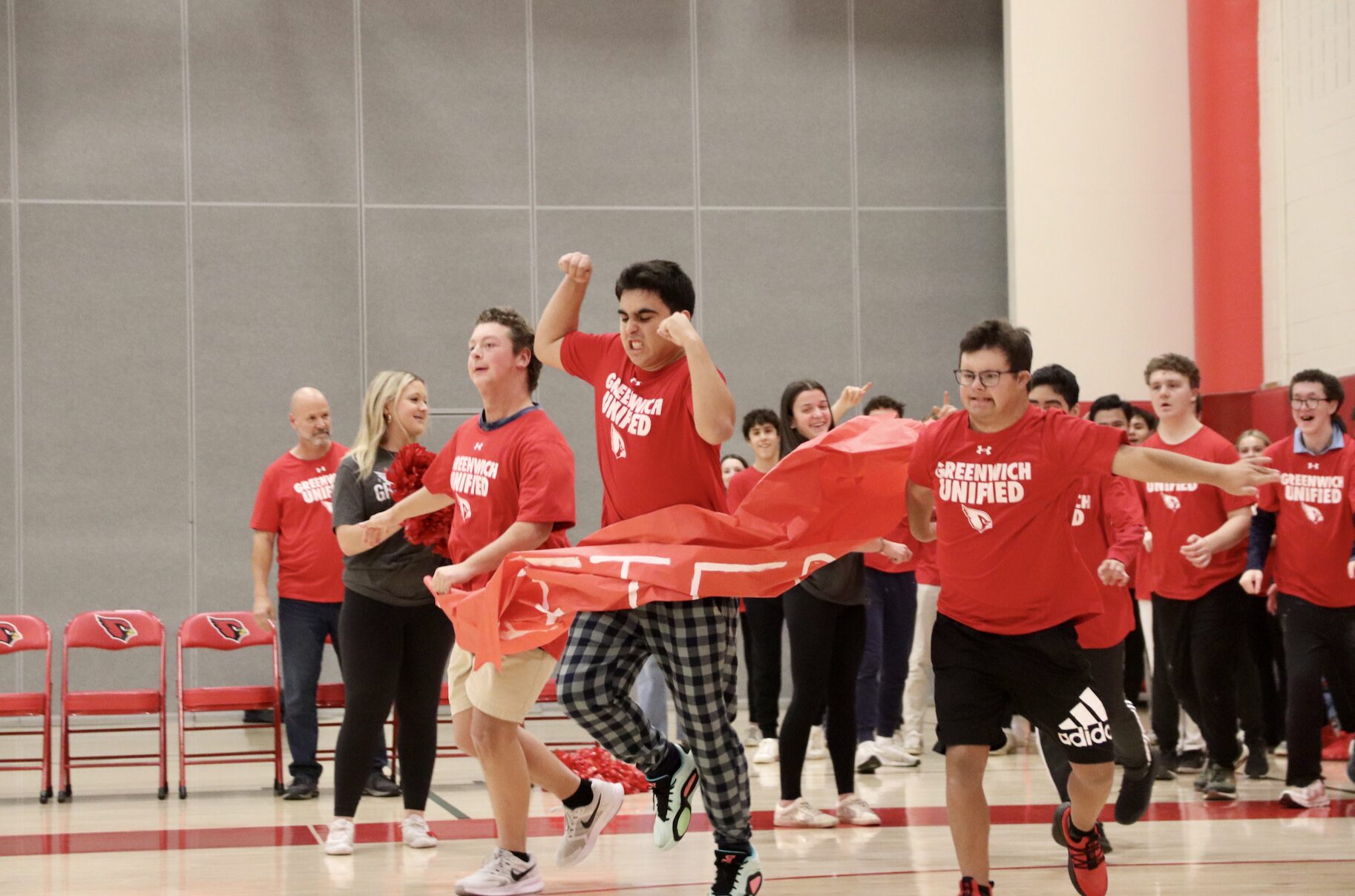 GHS Unified Sports players charged through a giant paper “Unified” banner in their game vs Norwalk. Dec 16, 2024 Photo: Leslie Yager