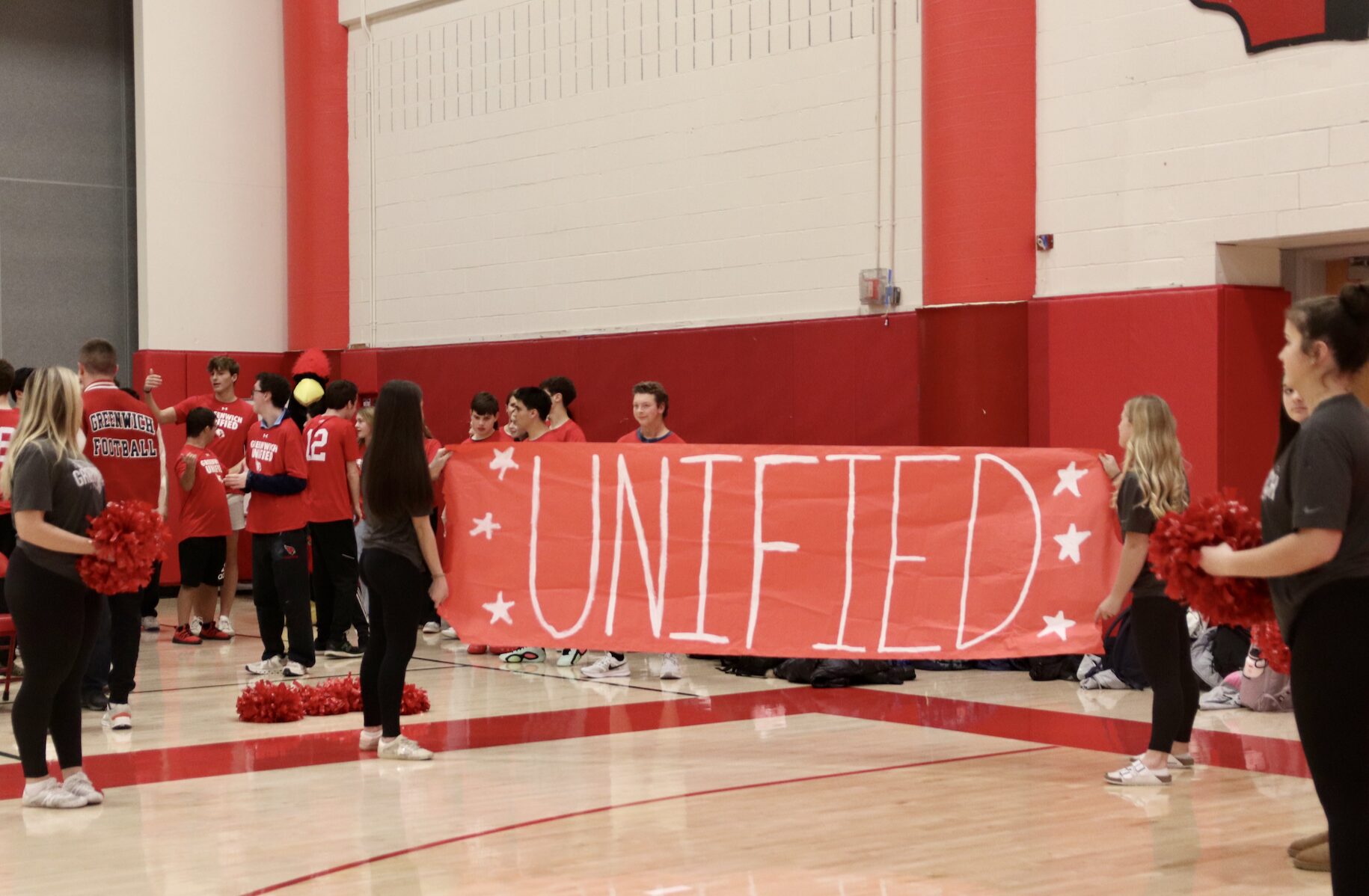 After the GHS Unified Sports players warmed up, the cheerleaders prepared a giant paper “Unified” banner for them to charge through, kicking off the enthusiastic basketball game vs Norwalk. Dec 16, 2024 Photo: Leslie Yager