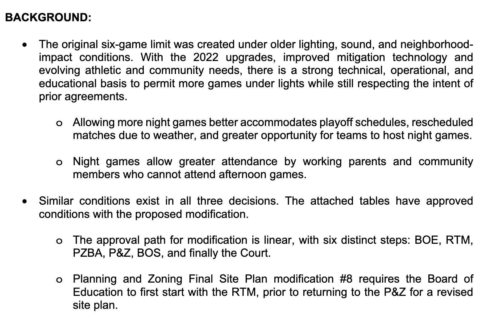 He said modifications would require a very lengthy linear process, starting at the BOE, then RTM, then P&Z Board of Appeals, then P&Z, then Board of Selectmen, and lastly moving to superior court.