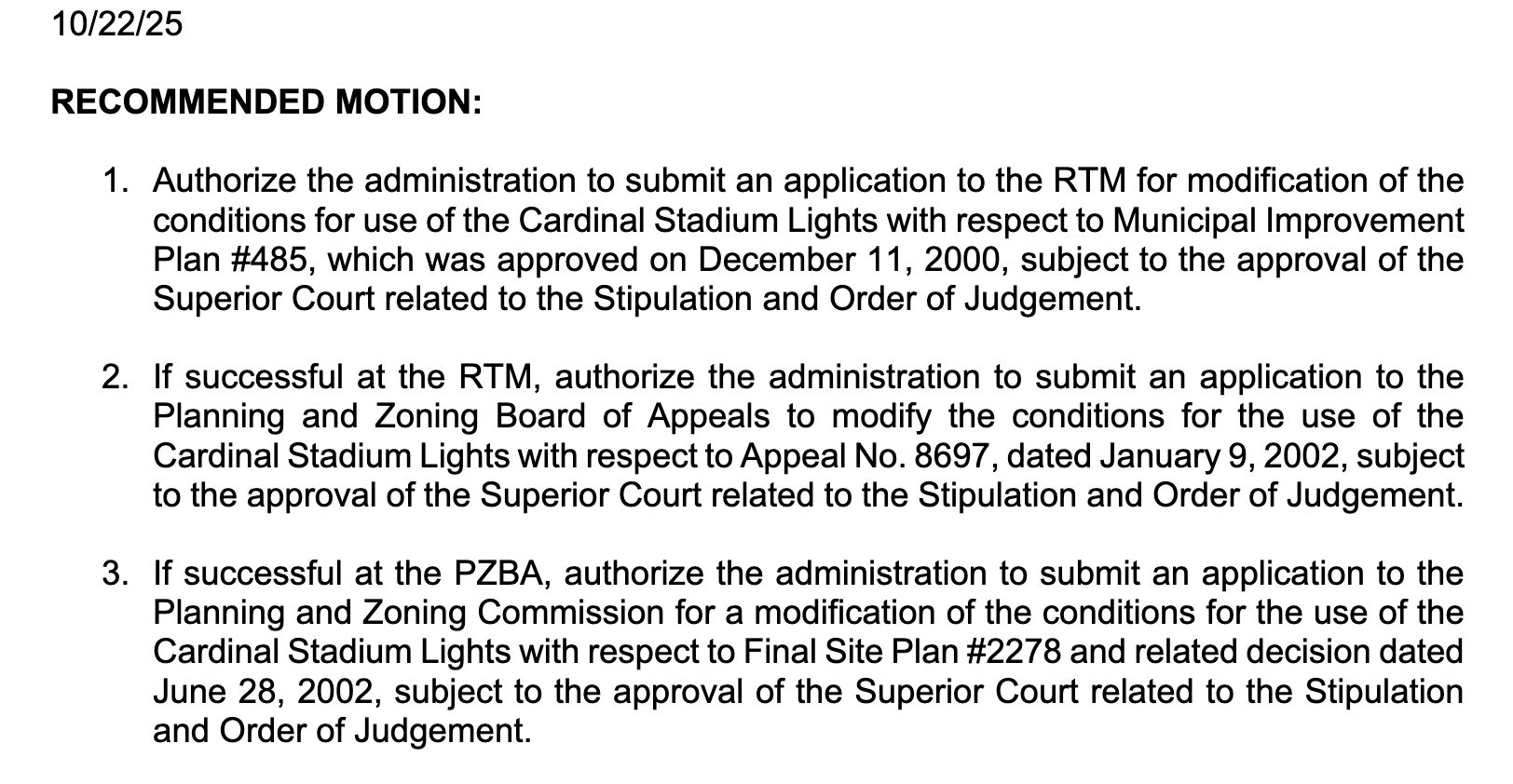 During board discussion on modifying the conditions for Lights at Cardinal Stadium, district COO Ben Branyan explained the legal process, suggesting three motions. (below).